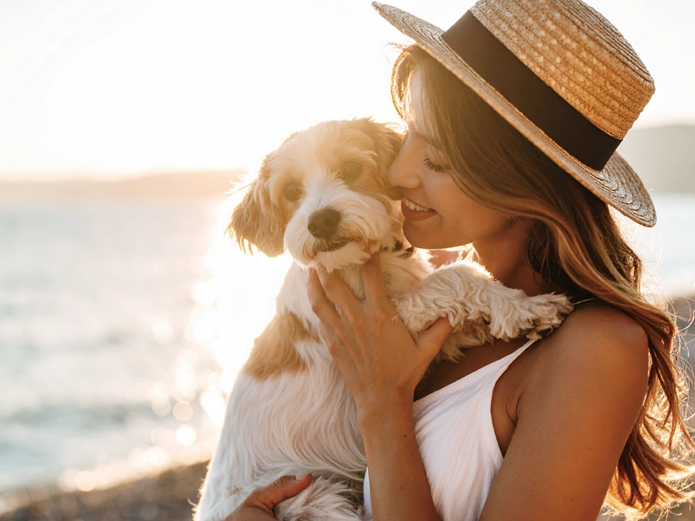 女性が犬を抱えている写真